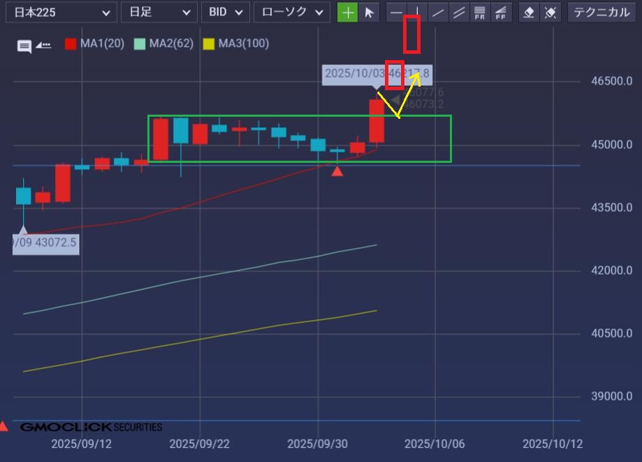 総裁選の御祝儀相場と、貯まってた空売りに引火して日足2連3連陽線ドンドンドンの
