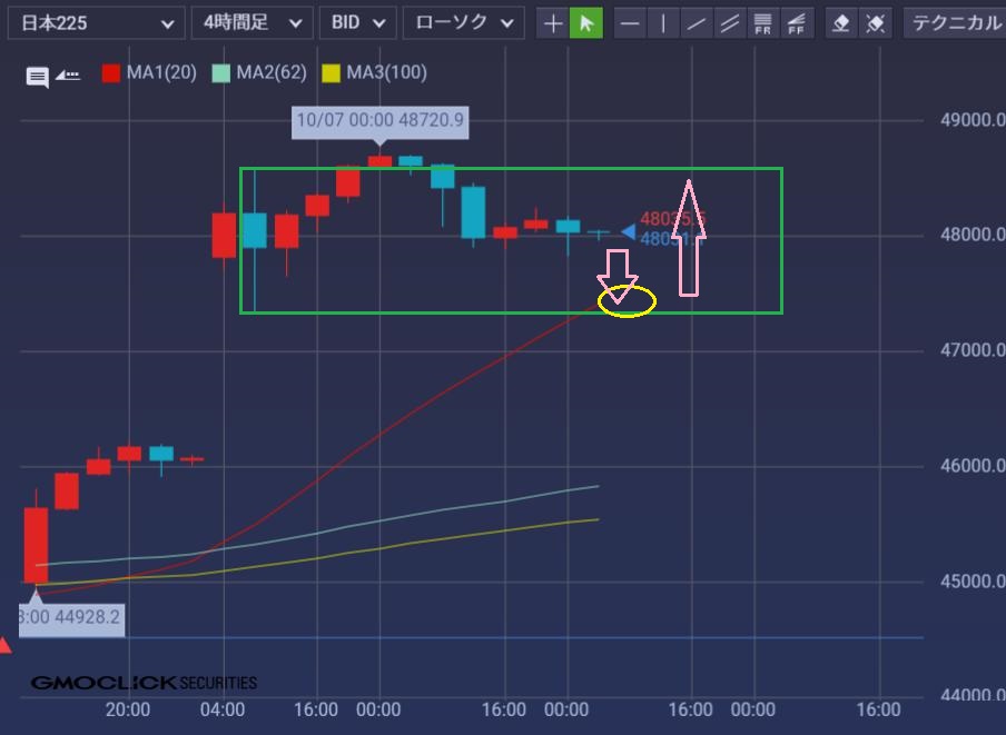 下限と安値(黄)の反応見て判断。割れれば、窓埋めも。