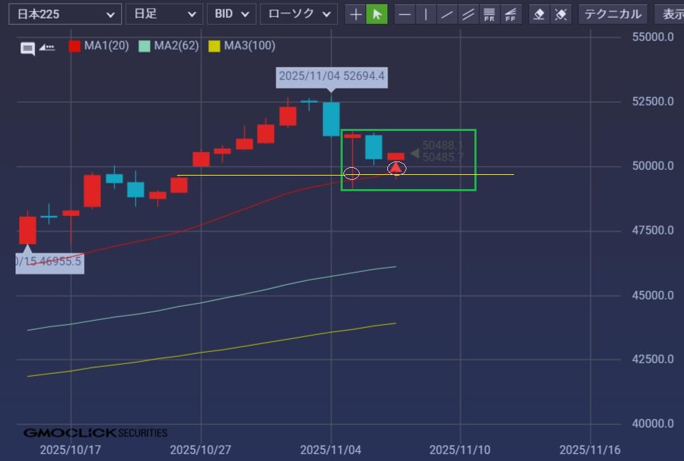 そこに日足高値と20本線があり、うりかたにとっては売りのポイント。