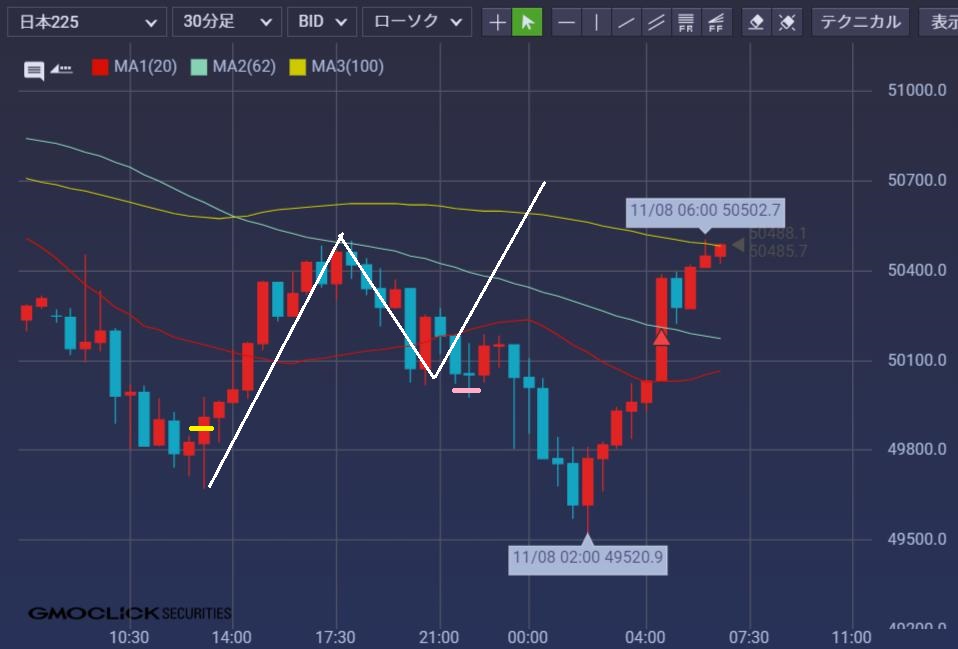 白線イメージの思惑外れ。500円弱の含み益を50円で利食い