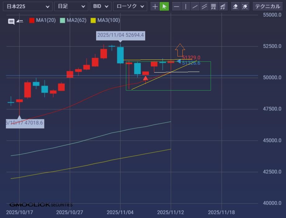 もう1回安値3連(白)と20日線の絡みで売り勢力の下押し失敗あれば