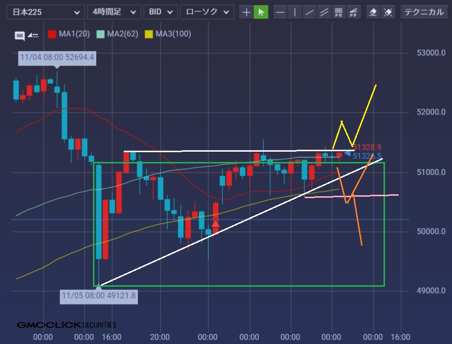 日足と同じくフラッグ形成。朝の飛び出せ青春等で抜ければリテスト買い(黄)。