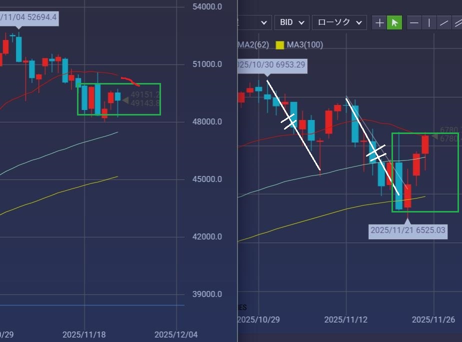 SP500次第(右)。2波動調整(白)で大トンカチで下押し失敗してカウンター取られてる。