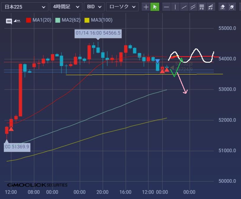 この3パターン。53509でどうなるか結果見ないと売り買い両勢力ともに
