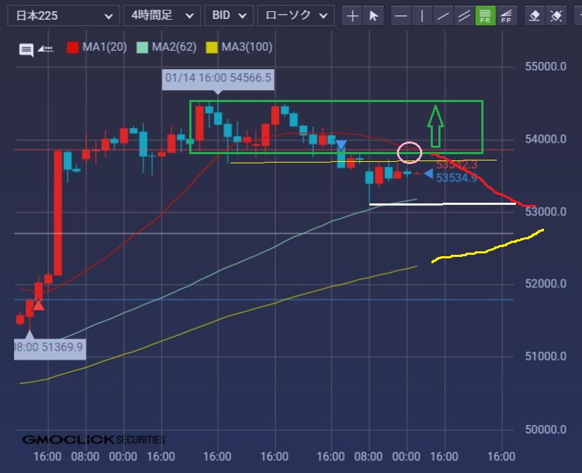 上に20本線、レンジ下限、日足安(黄)がありかなり重い。