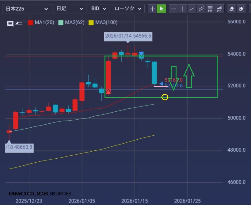 ここでレンジ下限まで売りが入るか、下押し失敗で上限行くのかというところ。