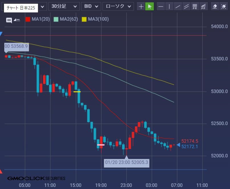 前日安値(桃)チェックスからの動き注視。