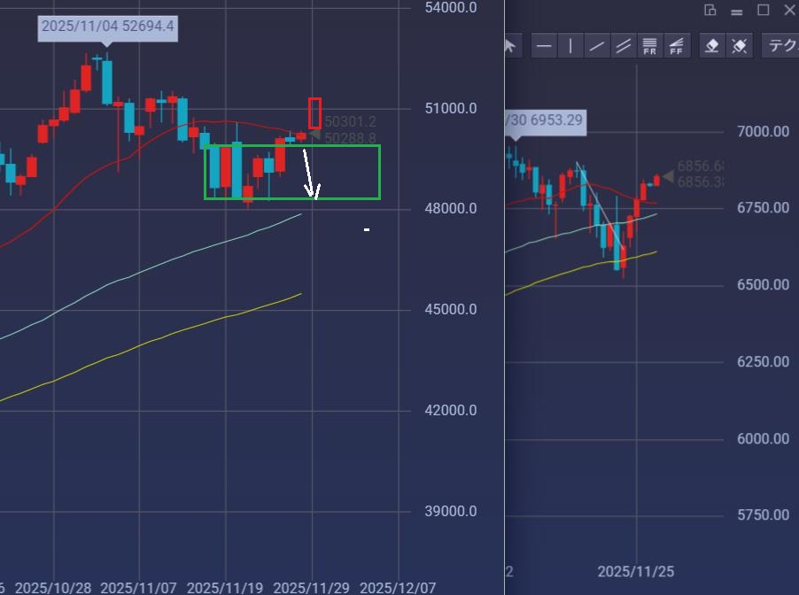 SP500(右)の日足は2波動調整終えて20日線ブチ抜き龍で上目線。