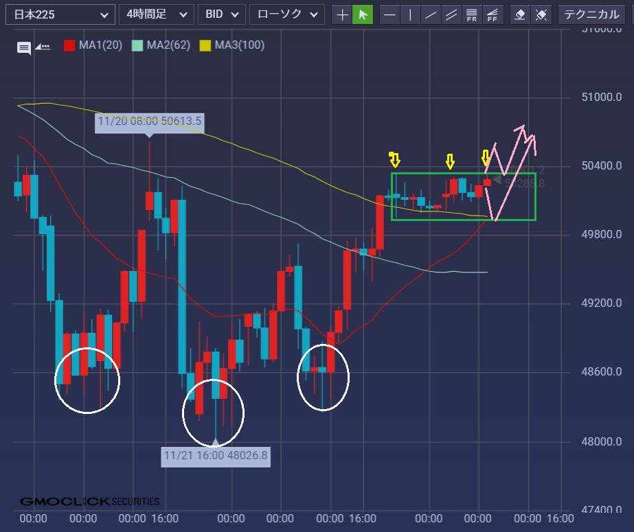ブレイクならリテストで買い。下げるようなら、レンジ下限と100本線と20本線処に到達で