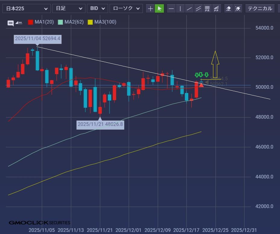 20日線ブレイク後の押下げ(緑矢)。
