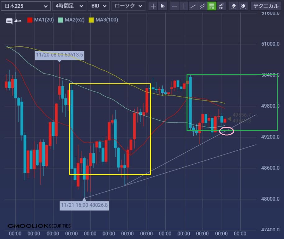 レンジ下限(緑)とのクロスポイント(桃)での反応。何かしらサイン出てはっきりする。