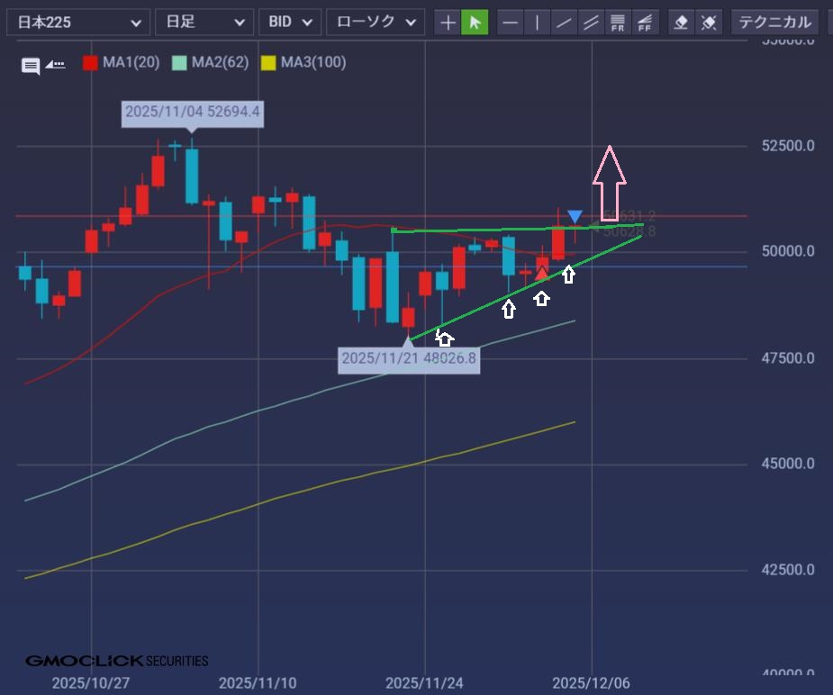 フラッグブレイク夜明け前。下値徐々に切り上げで既に20日線上に浮上中。