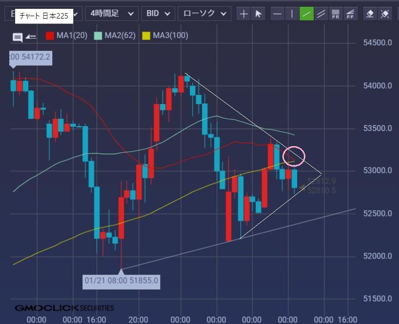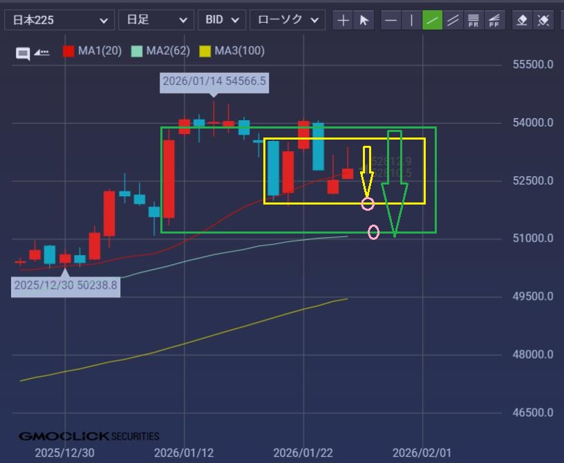 日足レンジ下限への動きに加えトレンドラインと20本千100本線(桃丸)