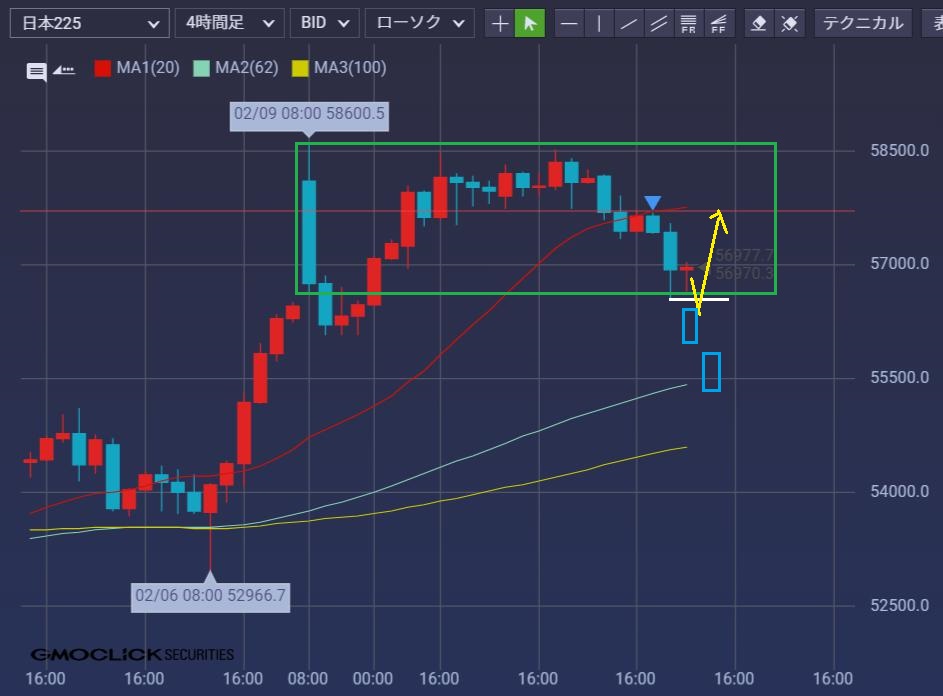 上いくにしても下行くにしても日足安値(白)のアクションで明確になる。