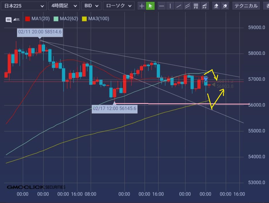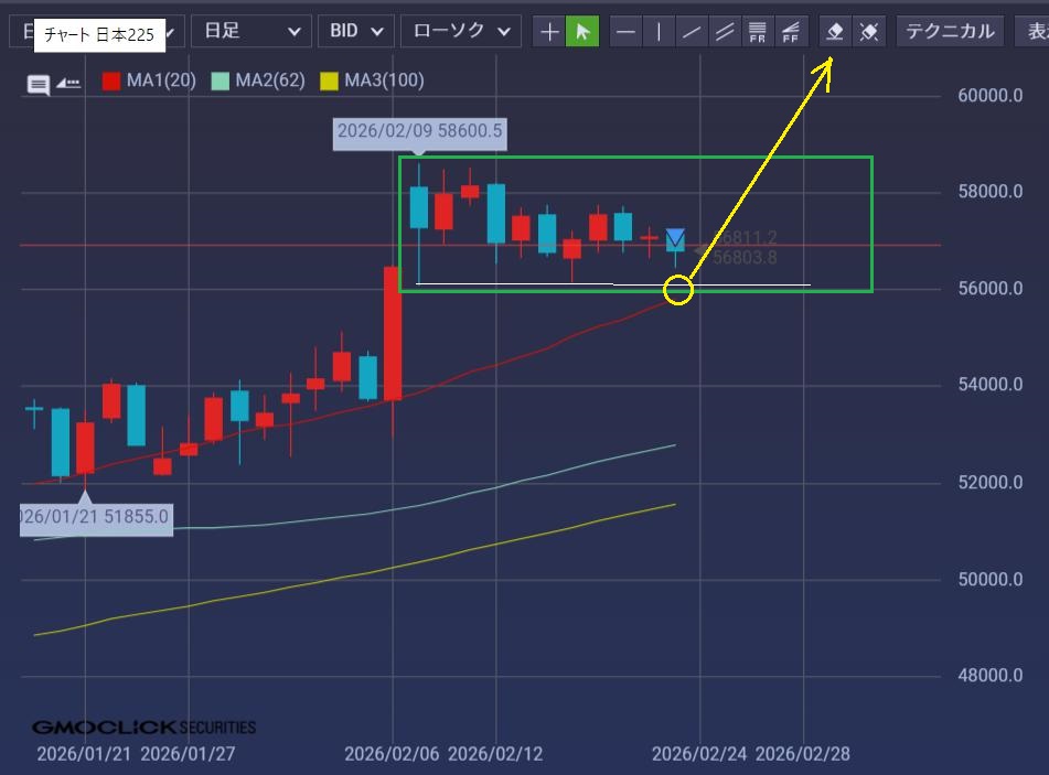 レンジ下限と20日線割れ失敗からのレンジ上ブレイクを想定。