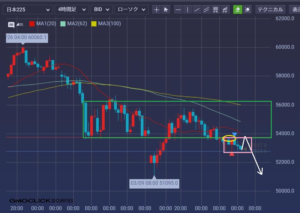 レンジ下限に復帰しようとして4時間足レベルでの失敗(黄)。