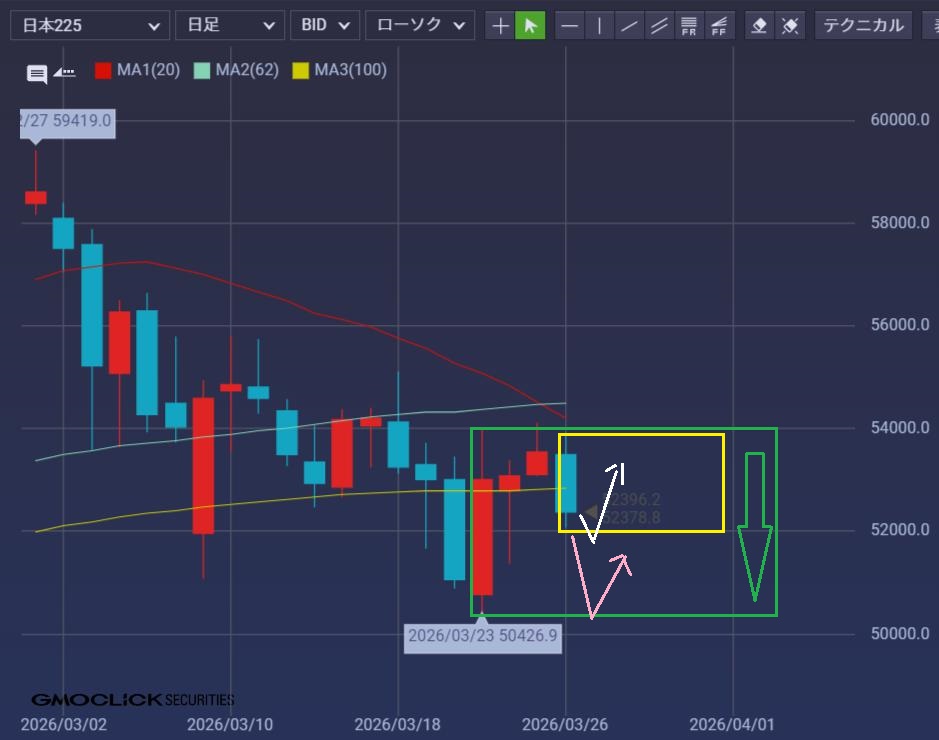 朝1は黄レンジ下限から反発あるかどうかをチェックス(白)。