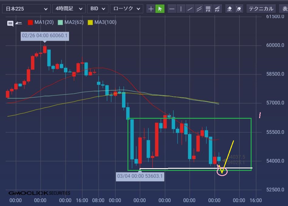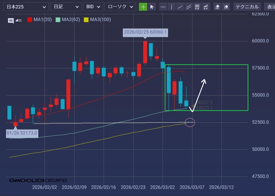 通常モードならレンジ(緑)下限からの反転で上限の動きですが、土日でイラン戦争が好転しない限りはギャップダウンスタート。日足安値2本(白)と100日線のクロスポイント52500前後で