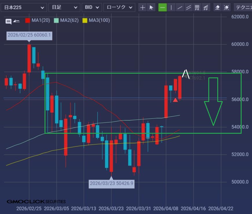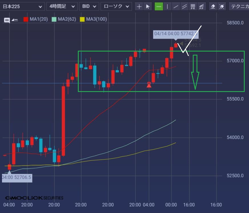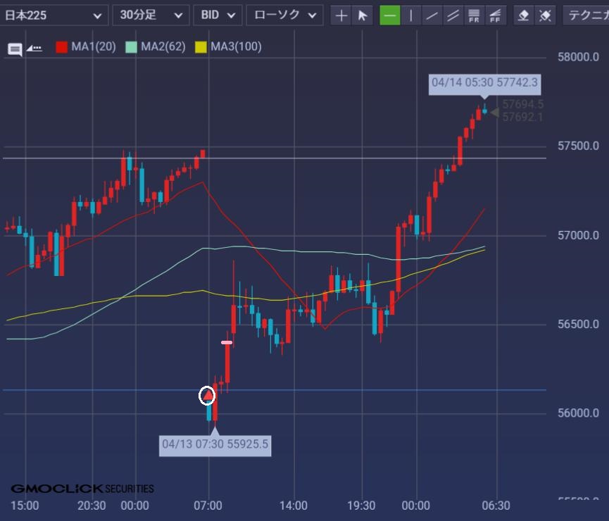 1日で2000円弱の上昇。今日は一服の陰線を想定。