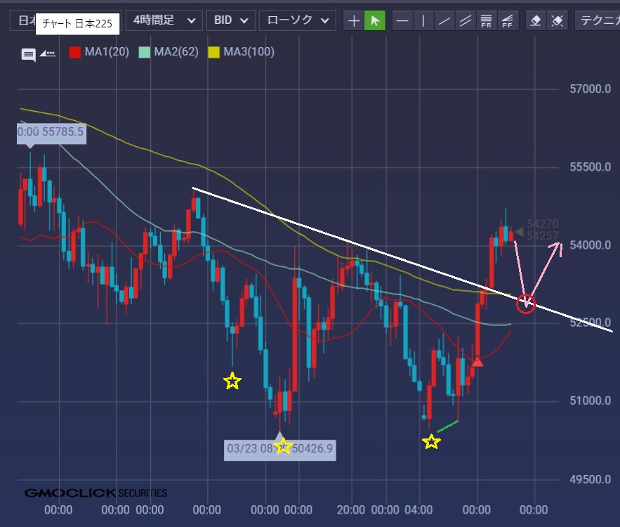 ココから上は56000処からの押下げ圧力の上髭3本とダメ押し1本(桃)。