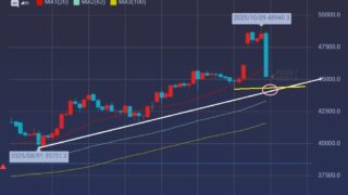 テクニカル勉強会 日経先物 10月13日 展望 日経先物日足トレンドライン(白)と日足安(黄)と61.8押し処のゾーン(桃)。ここで止まれるかが焦点。もう1本長いの出るようなら暴落。桃丸ゾーンで反転足探し。おそらくチェックス既定路線。4時間足日足安(白)ゾーンからの反転狙い(黄)。20本... 2025.10.12 テクニカル勉強会